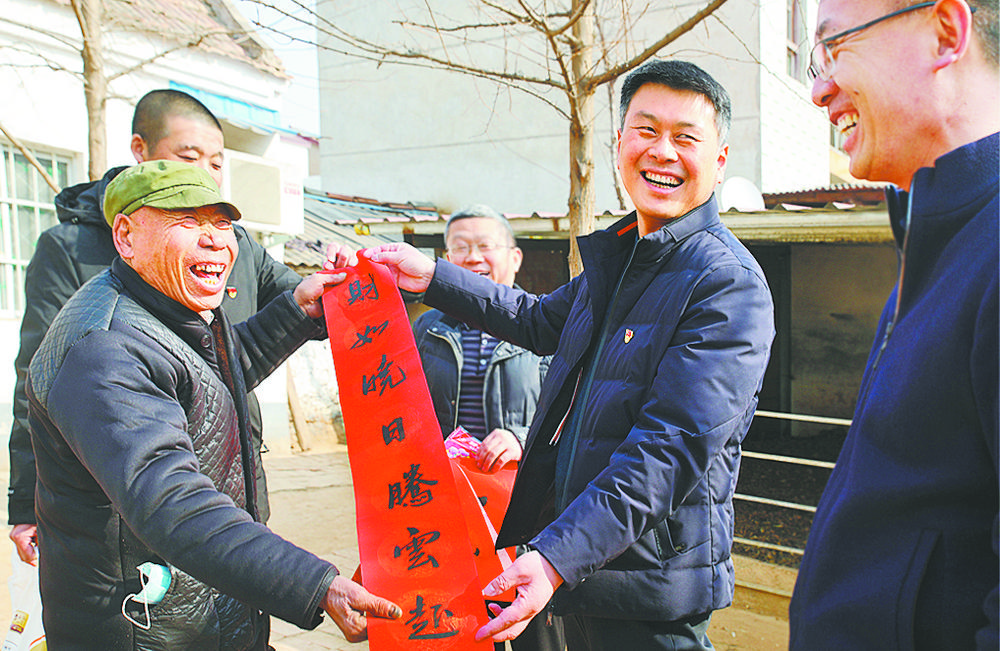 ▼2月4日,河南省尉氏县邢庄乡帮扶干部来到簸箕任村脱贫后年逾70岁的任留喜(左一)家中,送上新春对联。春节临近,尉氏县开展“话脱贫、感党恩、奋进新时代”活动,喜迎新春。 李鑫一摄