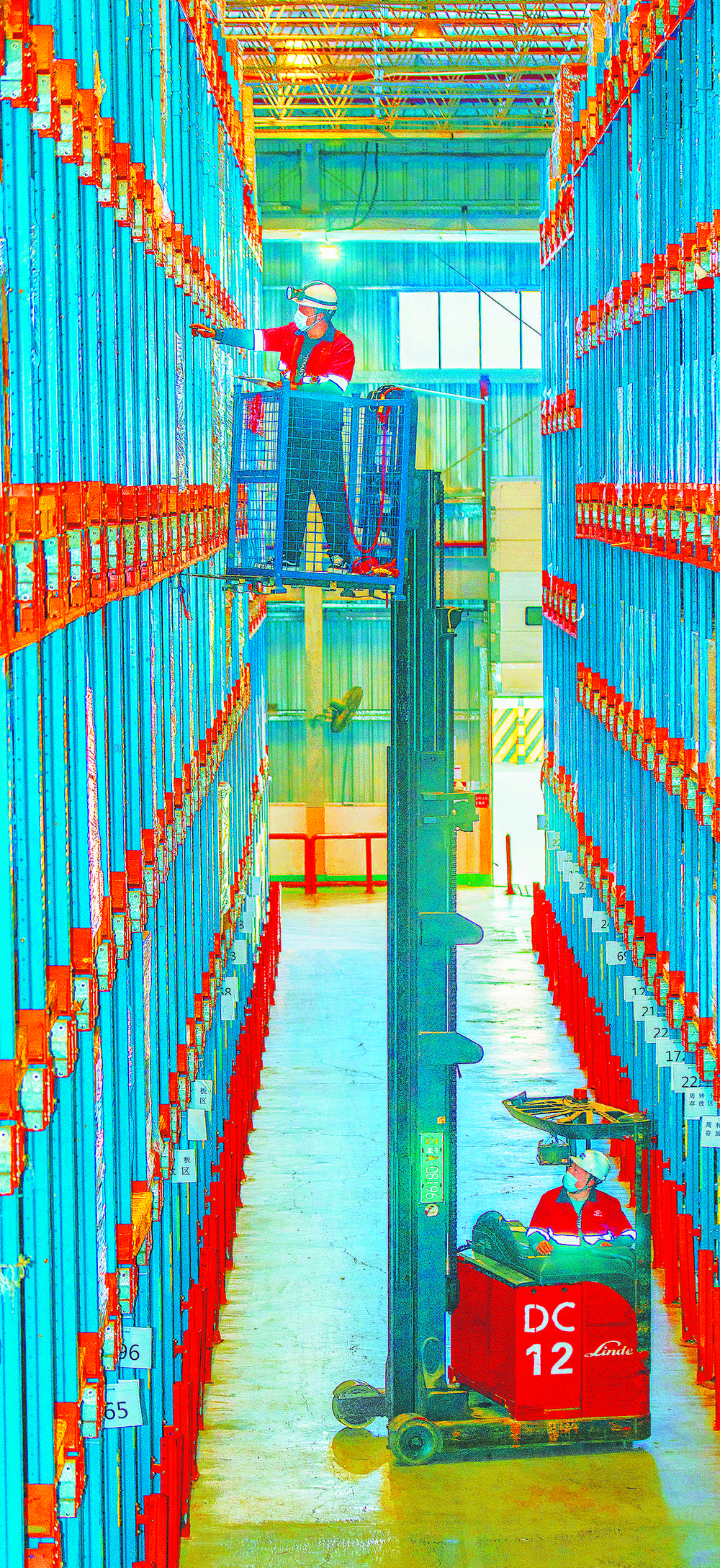 ▲2月14日,广东省广州市中外运物流华南有限公司,员工坚守岗位在货架上分拣货物进行出库装车,有效保障节日期间物流配送不断档。 邱新生摄