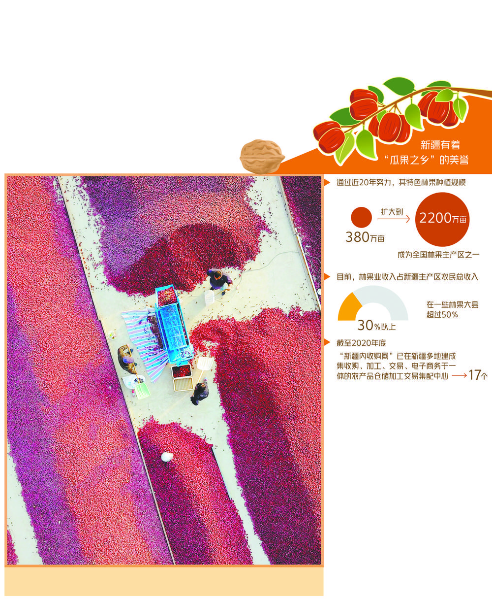 2018年起,新疆依托自治区供销合作社所属新疆果业集团有限责任公司,编织疆内收购网和疆外销售网“两张网”,截至2020年底,已使100万农村群众增收。