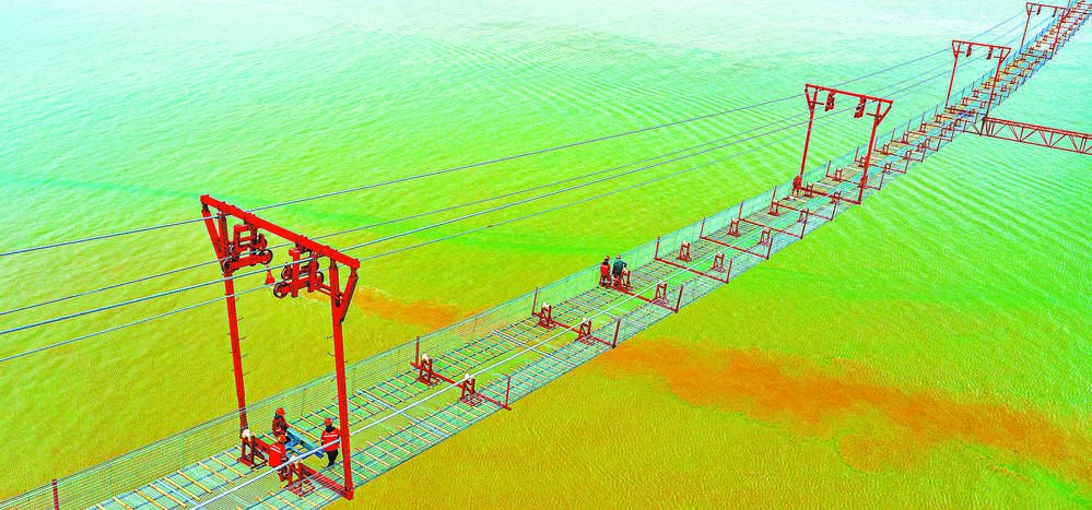 近日,浙江省温州市瓯江口新区北口大桥,建设者在空中施工便道上进行施工。瓯江口北口大桥是目前世界上首座三塔四跨双层钢桁梁悬索桥。大桥通车后,甬莞高速温州段项目将全面建成,乐清过江到龙湾国际机场从过去的1个多小时缩短至15分钟。