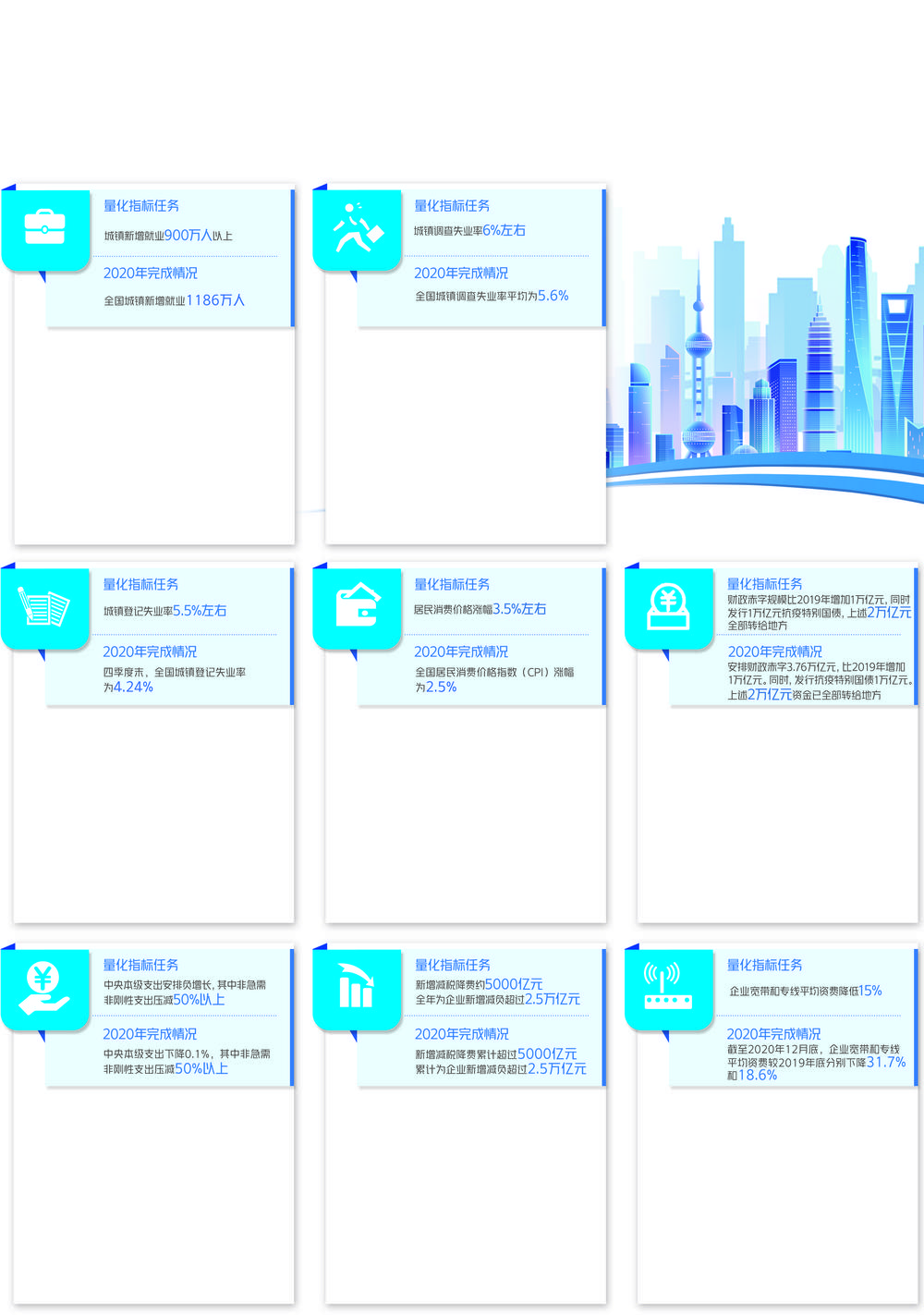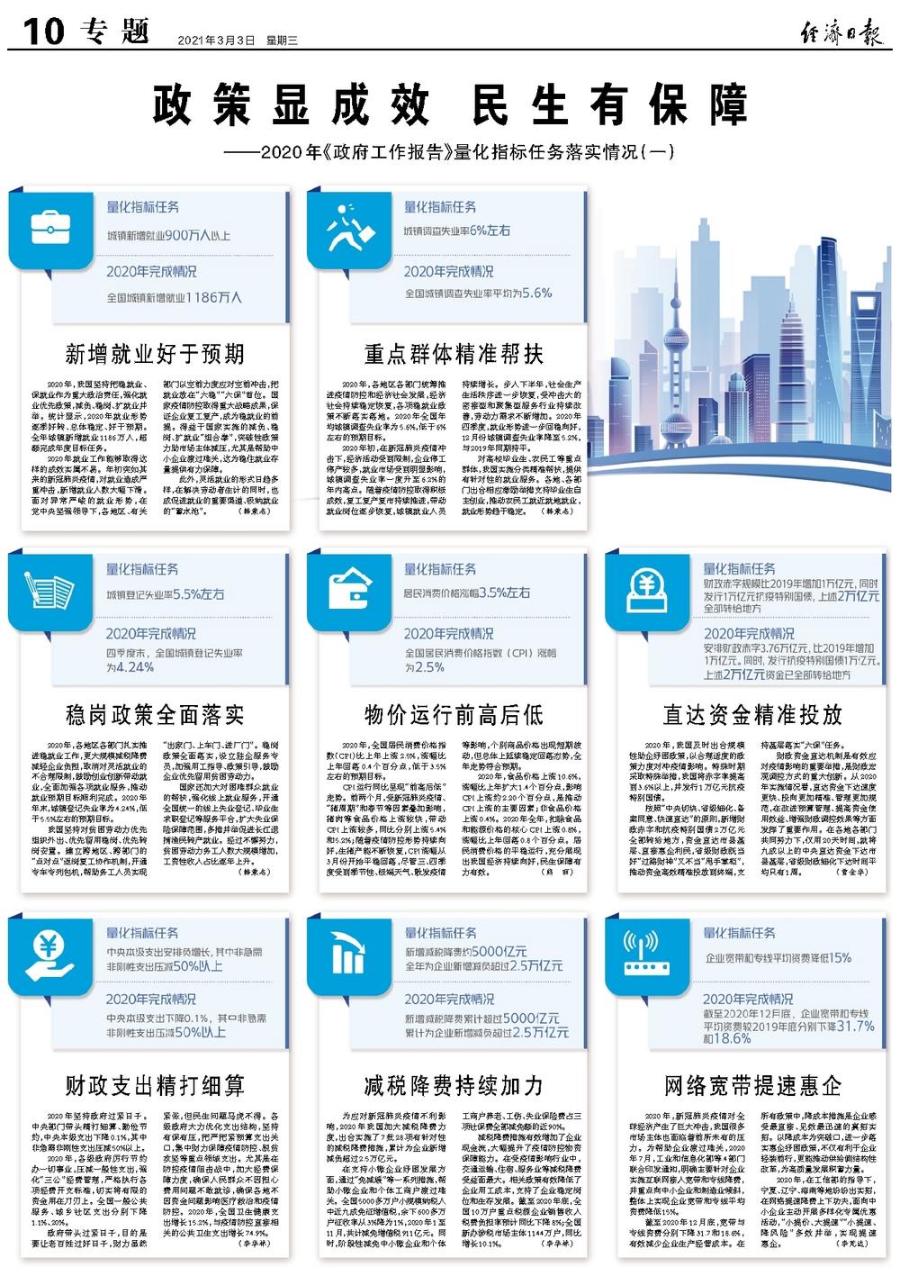 2020年,各地区各部门扎实推进稳就业工作,更大规模减税降费减轻企业负担,取消对灵活就业的不合理限制,鼓励创业创新带动就业,全面加强各项就业服务,推动就业预期目标顺利完成。2020年年末,城镇登记失业率为4.24%,低于5.5%左右的预期目标。