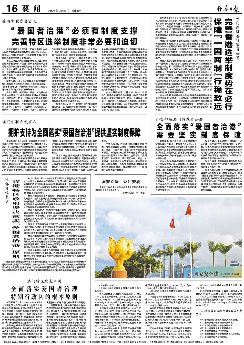 林郑月娥表示,立法工作刻不容缓,特区政府必定全力以赴反映香港社会各界意见,协助全国人大常务委员会修订基本法附件一和附件二,并按稍后经通过的附件条文制定修改本地的相关选举法例,交立法会审议。