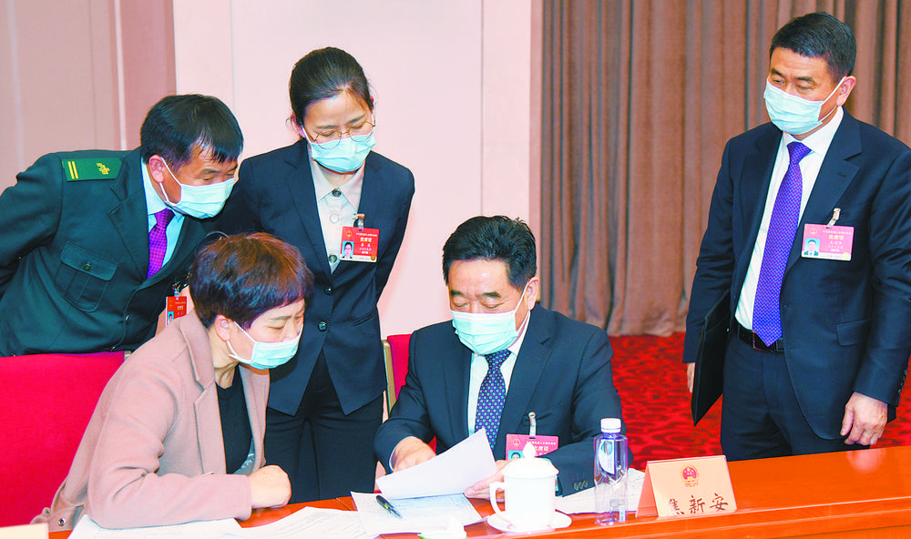 三月五日下午,人大江苏代表团举行全体会议,审议政府工作报告。会议结束后,全国人大代表张爱军(右二)、高苏娟(左二)、殷勇(左一)、李薇(左三)、王利平(右一)就农村养老、医疗改革、食品安全等开展讨论。肖 勇摄(中经视觉)