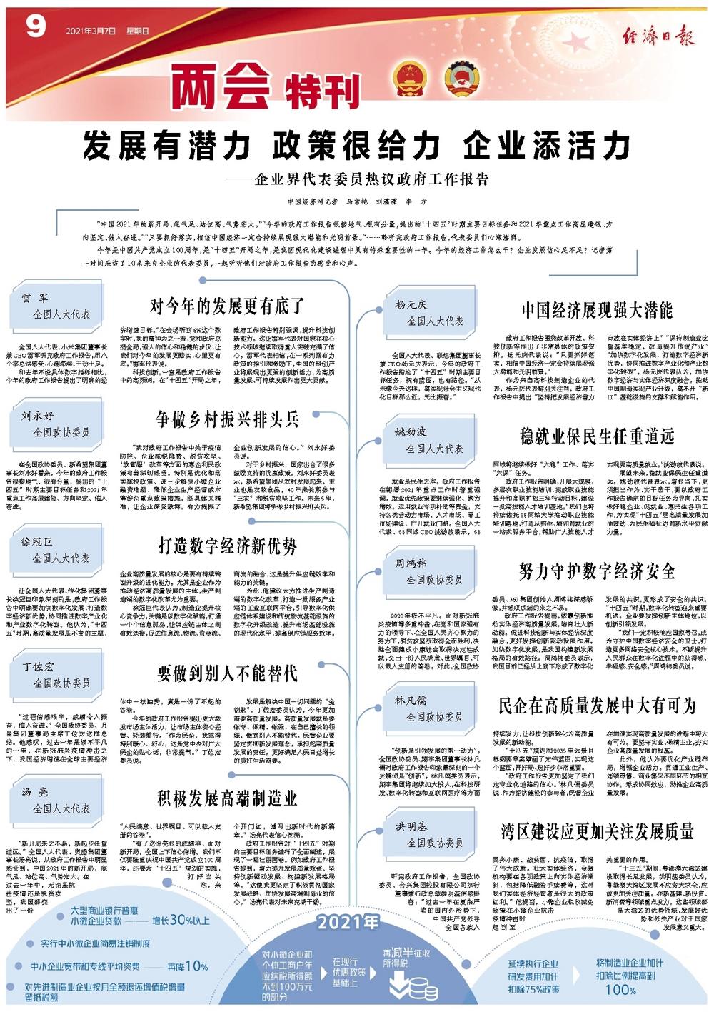今年是中国共产党成立100周年,是“十四五”开局之年,是我国现代化建设进程中具有特殊重要性的一年。今年的经济工作怎么干?企业发展信心足不足?记者第一时间采访了10名来自企业的代表委员,一起听听他们对政府工作报告的感受和心声。