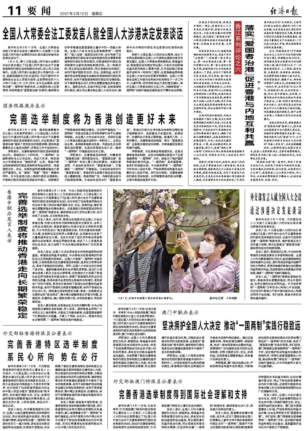 发言人表示,连日来,香港社会高度关注全国人大会议涉港议程,行政长官林郑月娥和特区政府主要官员、各界人士和各社团机构、香港普通民众均表示坚决支持和热烈期盼,不少市民自发以“落实爱国者治港,支持完善选举制度”为主题,发起街站签名和网上联署活动,各类媒体也发表了大量报道和言论文章。这充分反映了经历多年政治争拗和剧烈社会动荡后,香港各界痛定思痛,形成了人心思稳思进的社会共识,有力说明了中央决策在香港具有广泛的民意基础。