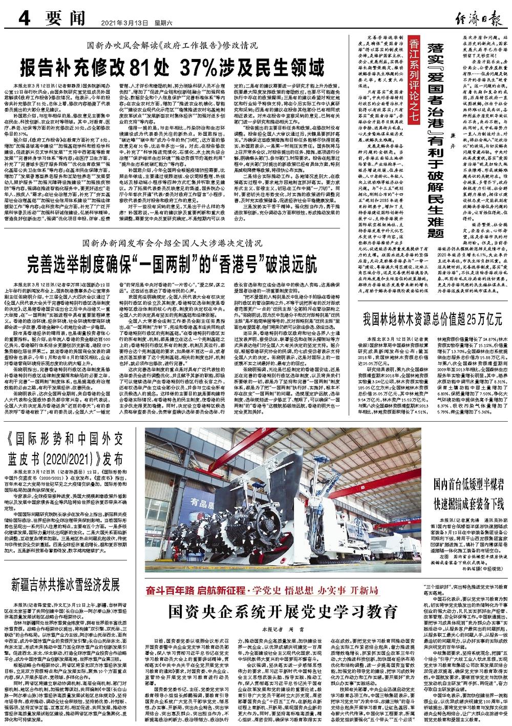 值得一提的是,与去年相比,污染防治和生态环境建设成为代表委员关注的新热点。孙国君指出,“碳达峰”“碳中和”成为今年的热门词汇,这方面的修改意见有31条,比去年多出一倍。对此,在报告修改中,补充了“科学推进荒漠化、石漠化、水土流失综合治理”“保护海洋生态环境”“推动资源节约高效利用”“提升生态系统碳汇能力”等内容。