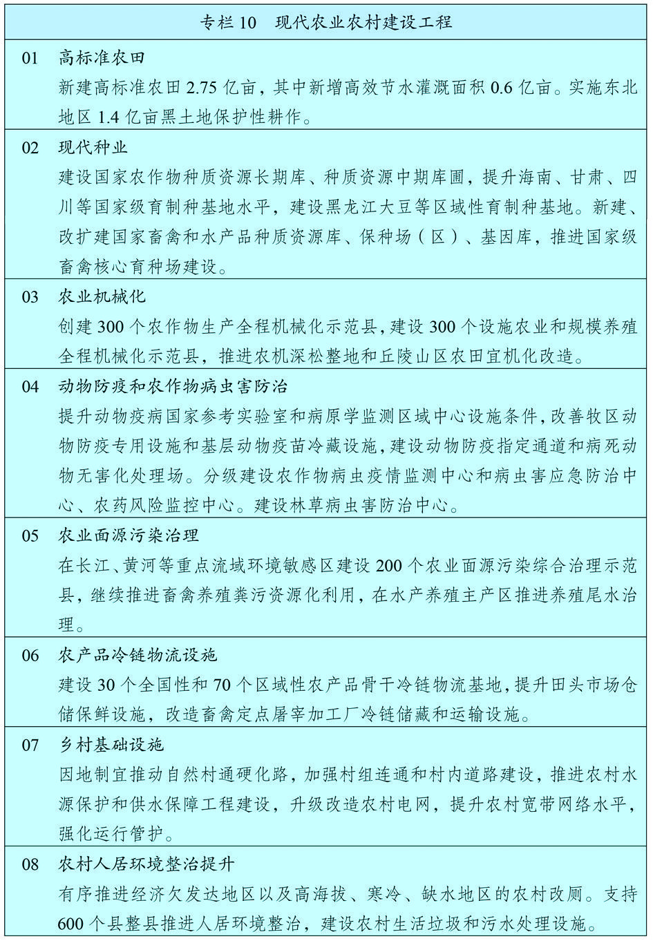 夯实粮食生产能力基础,保障粮、棉、油、糖、肉、奶等重要农产品供给安全。坚持最严格的耕地保护制度,强化耕地数量保护和质量提升,严守18亿亩耕地红线,遏制耕地“非农化”、防止“非粮化”,规范耕地占补平衡,严禁占优补劣、占水田补旱地。以粮食生产功能区和重要农产品生产保护区为重点,建设国家粮食安全产业带,实施高标准农田建设工程,建成10.75亿亩集中连片高标准农田。实施黑土地保护工程,加强东北黑土地保护和地力恢复。推进大中型灌区节水改造和精细化管理,建设节水灌溉骨干工程,同步推进水价综合改革。加强大中型、智能化、复合型农业机械研发应用,农作物耕种收综合机械化率提高到75%。加强种质资源保护利用和种子库建设,确保种源安全。加强农业良种技术攻关,有序推进生物育种产业化应用,培育具有国际竞争力的种业龙头企业。完善农业科技创新体系,创新农技推广服务方式,建设智慧农业。加强动物防疫和农作物病虫害防治,强化农业气象服务。