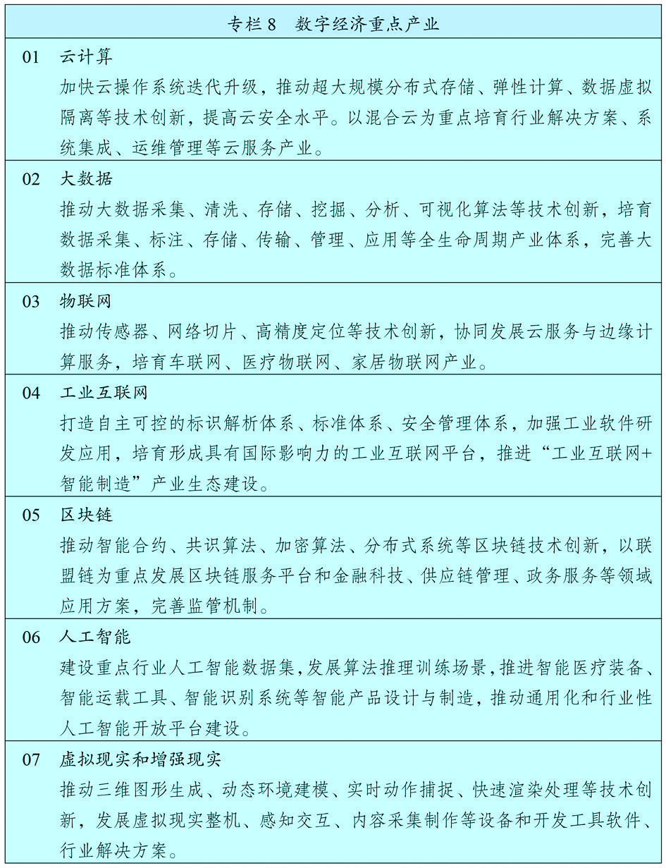 实施“上云用数赋智”行动,推动数据赋能全产业链协同转型。在重点行业和区域建设若干国际水准的工业互联网平台和数字化转型促进中心,深化研发设计、生产制造、经营管理、市场服务等环节的数字化应用,培育发展个性定制、柔性制造等新模式,加快产业园区数字化改造。深入推进服务业数字化转型,培育众包设计、智慧物流、新零售等新增长点。加快发展智慧农业,推进农业生产经营和管理服务数字化改造。