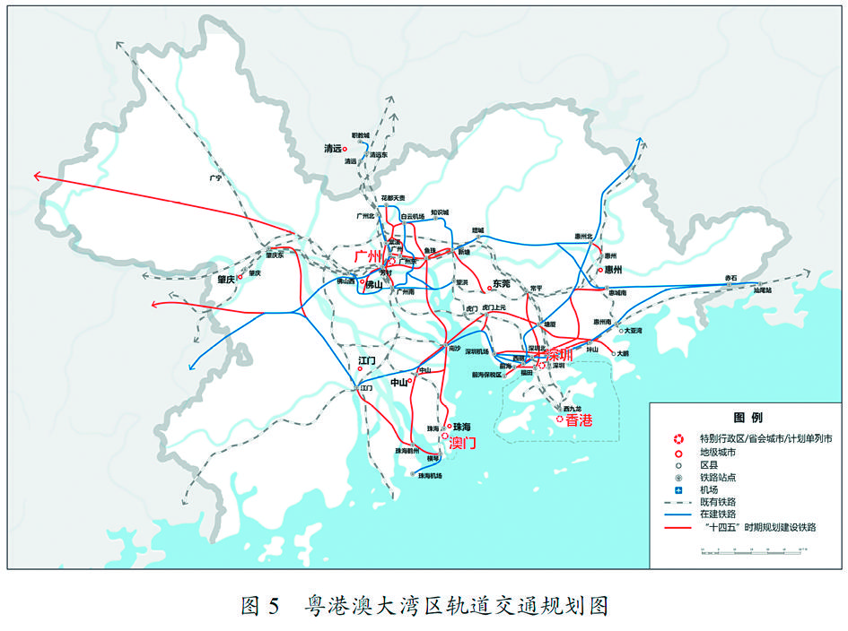 加强粤港澳产学研协同发展,完善广深港、广珠澳科技创新走廊和深港河套、粤澳横琴科技创新极点“两廊两点”架构体系,推进综合性国家科学中心建设,便利创新要素跨境流动。加快城际铁路建设,统筹港口和机场功能布局,优化航运和航空资源配置。深化通关模式改革,促进人员、货物、车辆便捷高效流动。扩大内地与港澳专业资格互认范围,深入推进重点领域规则衔接、机制对接。便利港澳青年到大湾区内地城市就学就业创业,打造粤港澳青少年交流精品品牌。