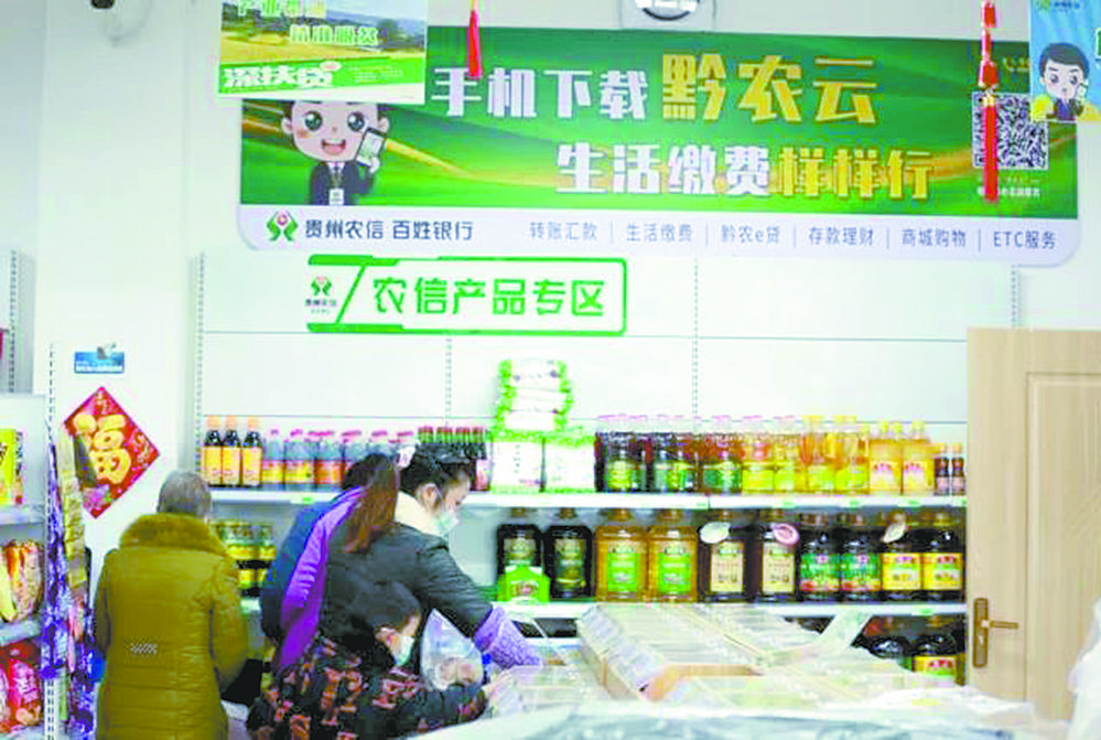 此外,遵义农信还按照“金融+商超+便民服务+N”模式,在镇村街道、村寨设立商超型“黔农村村通”,通过上线积分系统、整合超市上游供应链、叠加快递场景等方式,让群众在超市享受更优惠的价格、更便民的服务。