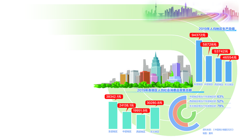 畅通国内国际双循环,需要发挥各地区优势,充分挖掘其潜力。从国内循环看,中西部内陆地区临近国内市场,加上资源富集、人口较多、发展水平相对较低,无论是扩大投资还是促进消费,都具有巨大的空间和发展潜力,是加快形成强大国内市场的关键所在。中国有61.4%的人口分布在中西部和东北地区,但东北地区2017年人均全社会固定资产投资额只有东部地区的57%;中部和西部地区2019年人均社会消费品零售总额仅分别相当于东部地区的63%和52%。这种悬殊差距反映了中西部和东北地区的投资空间和消费潜力巨大。如果中西部地区人均社会消费品零售总额达到东部地区的水平,将可增加12.3万亿元的消费需求。因此,畅通国内大循环既要增强沿海发达地区的国内大循环能力,更要促进中西部和东北地区的投资和消费,刺激其经济增长,尤其是北部地区的经济增长。