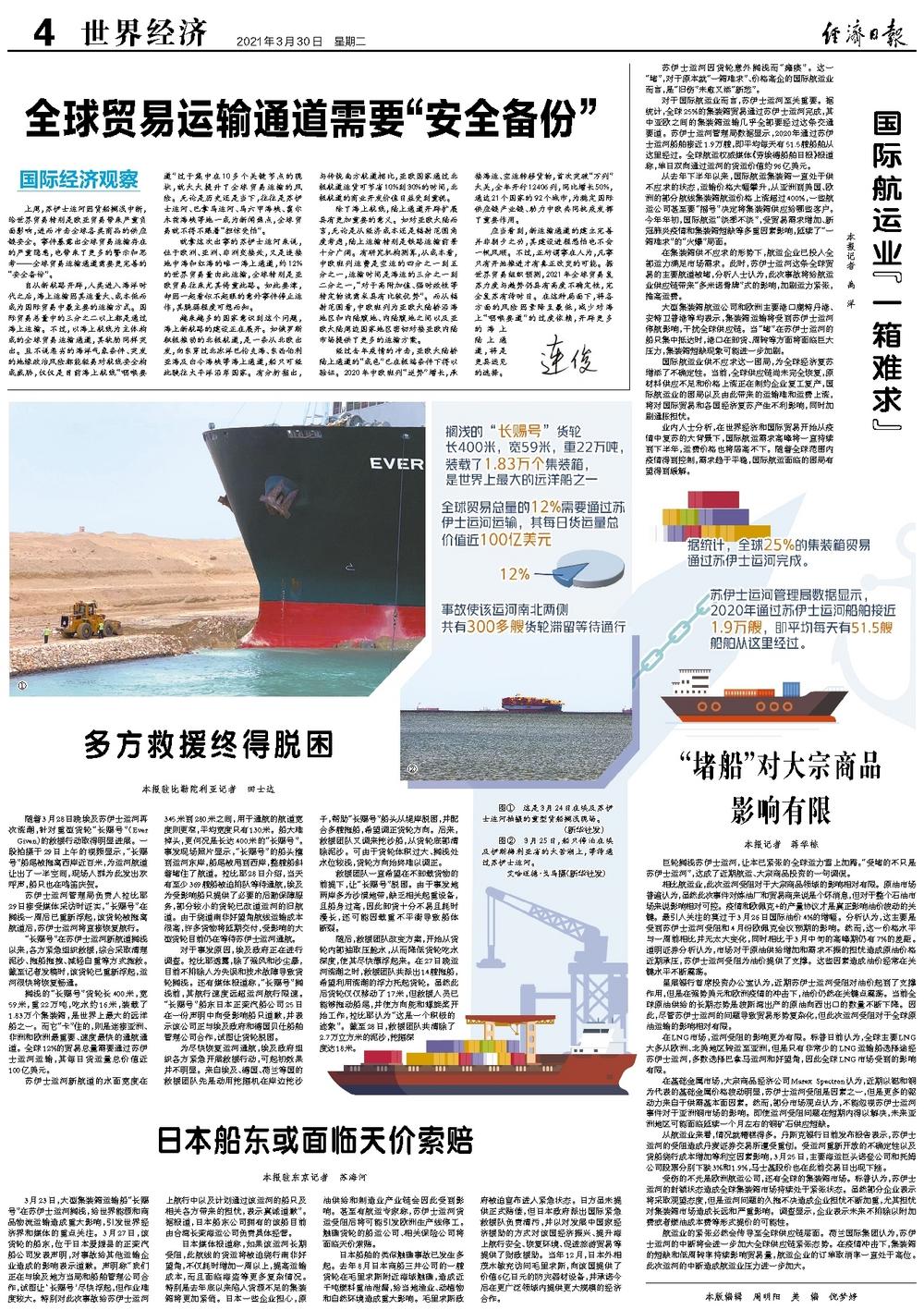 “长赐号”在苏伊士运河新航道搁浅以来,各方紧急组织救援,综合采取清理泥沙、拖船拖拽、减轻自重等方式施救。截至记者发稿时,该货轮已重新浮起,运河很快将恢复畅通。