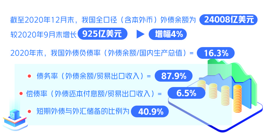 3月26日,国家外汇管理局公布的外债数据显示,截至2020年12月末,我国全口径(含本外币)外债余额为24008亿美元,较2020年9月末增长925亿美元,增幅4%。2020年四季度我国外债规模稳步增长。