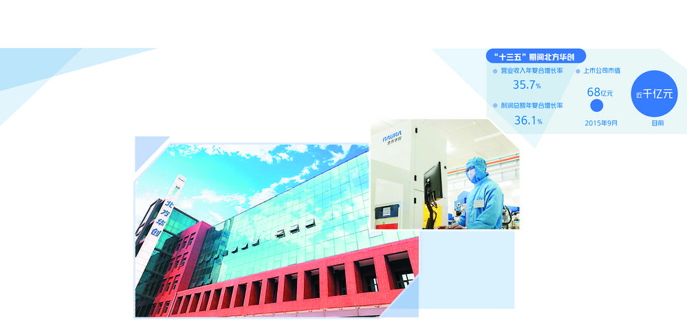 “十三五”期间,北方华创营业收入和利润总额年复合增长率分别达到35.7%和36.1%。上市公司市值也由2015年9月的68亿元增长到目前的近千亿元。