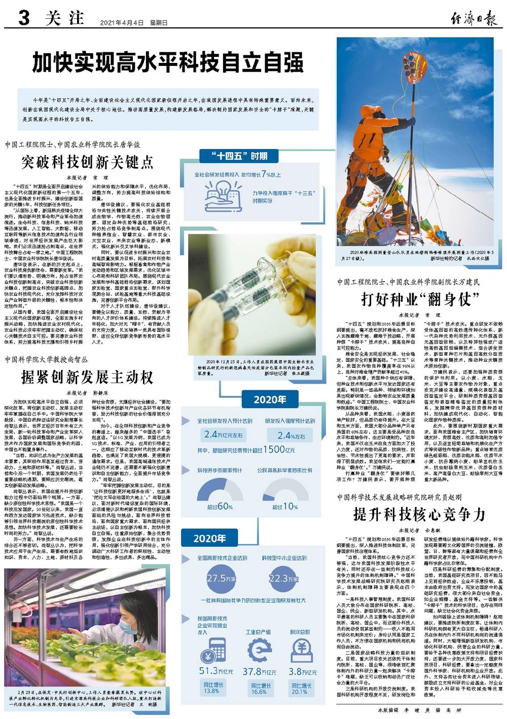 “十四五”时期是全面开启建设社会主义现代化国家新征程的第一个五年,也是全面推进乡村振兴、建设创新型国家的关键5年,科技创新任务艰巨。