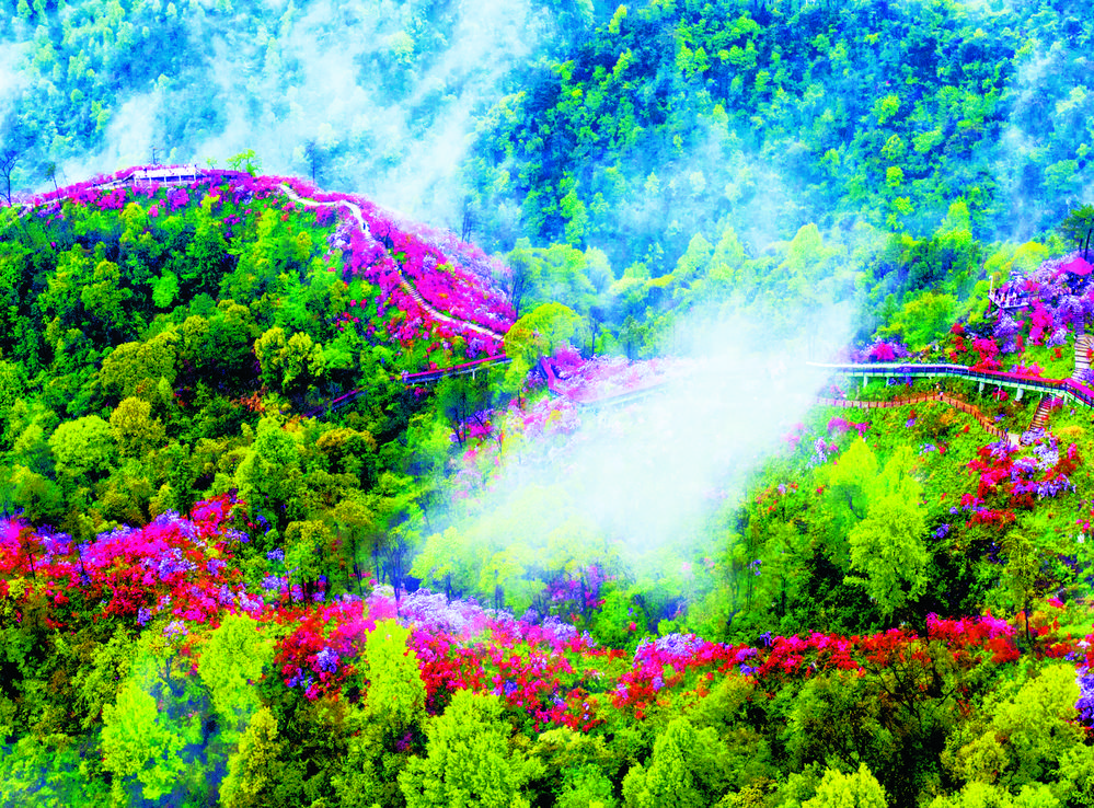 4月3日,云雾中的安徽省安庆市岳西县河图镇龙门大峡谷千亩野生高山杜鹃竞相开放,美不胜收。当日,河图镇春雨间歇,素有“华东第一大峡谷”美誉的龙门大峡谷山间云雾缭绕,姹紫嫣红,宛如仙境。清明假期,云雾杜鹃胜景迎来八方游客,人们徜徉其中,尽享“花海盛宴”。