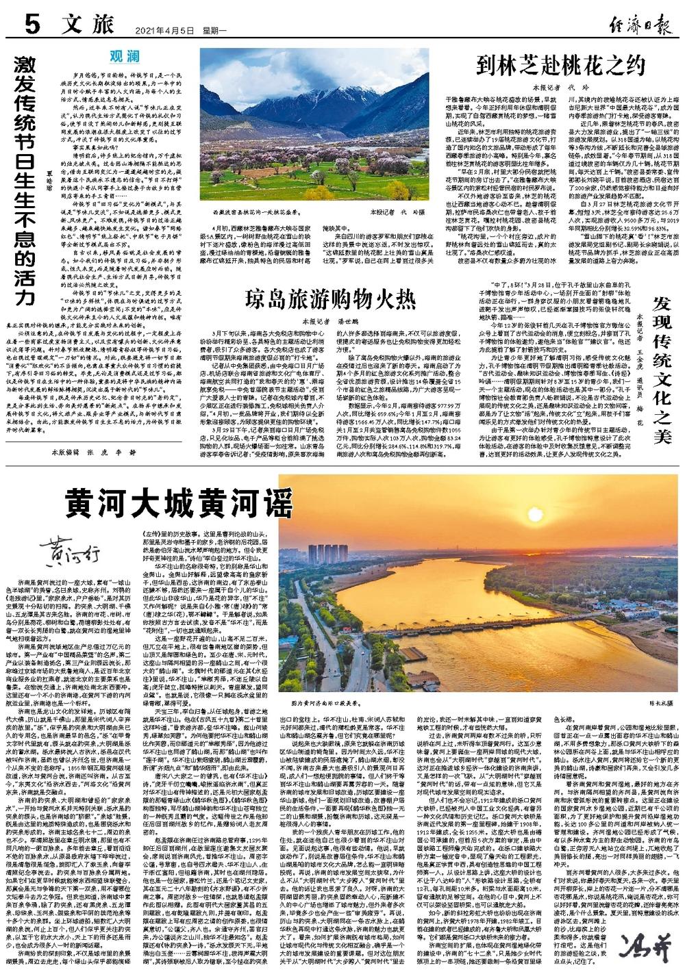 济南是黄河流过的一座大城,素有“一城山色半城湖”的美誉,名曰泉城,史称齐州。刘鹗的《老残游记》里,“家家泉水,户户垂杨”,是对其历史景观十分贴切的扫描。趵突泉、大明湖、千佛山、五龙潭是其古来名胜。济南的市花、市树、市鸟分别是荷花、柳树和白鹭,荷塘柳影处处有,有着一双长长秀腿的白鹭,就在黄河边的湿地里神气地扫视着远方。
