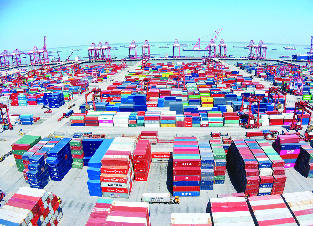 4月6日,江苏省太仓港集装箱码头繁忙作业中。该港口一季度累计完成集装箱吞吐量150.5万标箱,月度及季度吞吐量均破同期历史纪录。计海新摄(中经视觉)