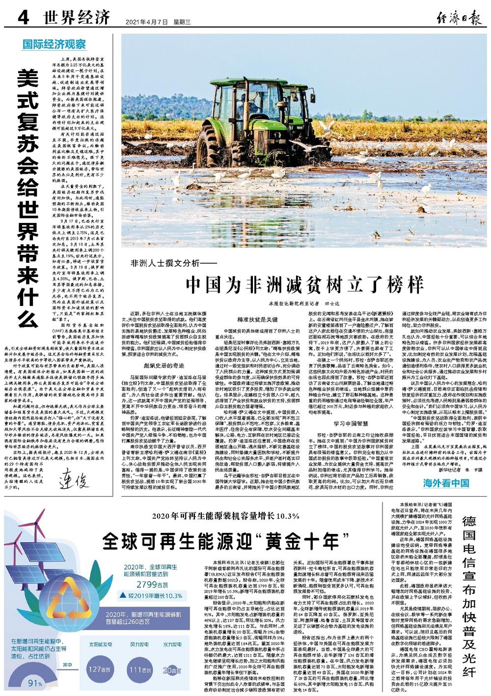 报告还指出,作为世界上最大的两个经济体,中国与美国在可再生能源发展方面表现最好。当前,中国是全球最大的可再生能源市场,去年新增了136吉瓦的清洁能源装机容量。在中国,风力发电新增装机容量达到72吉瓦,太阳能发电新增装机容量达到49吉瓦。美国在2020年新增了29吉瓦的可再生能源装机容量,同比增长80%,其中新增太阳能发电15吉瓦、风能发电14吉瓦。