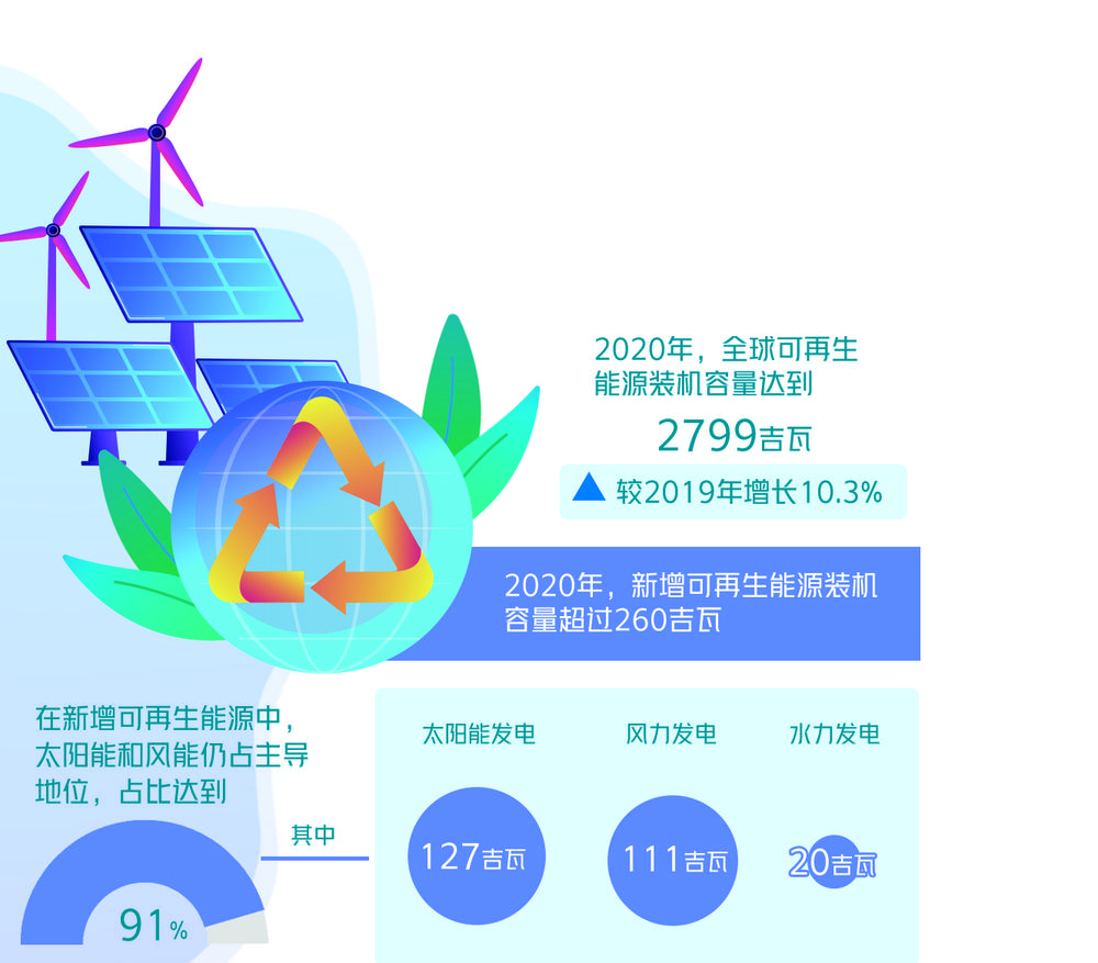 本报阿布扎比讯(记者王俊鹏)总部位于阿联酋首都阿布扎比的国际可再生能源署(IRENA)近日发布报告《可再生能源装机容量数据2021》。报告称,2020年,全球可再生能源装机容量达到2799吉瓦,较2019年增长10.3%;新增可再生能源装机容量超过260吉瓦。