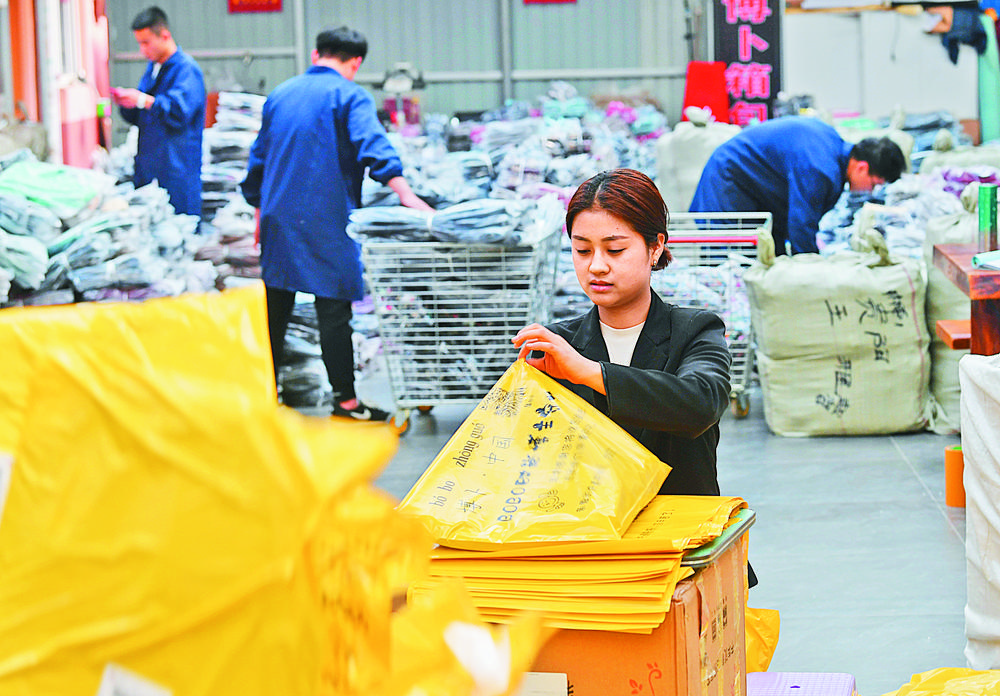 4月6日,位于河北省白沟新城的一家企业内,员工正在为即将出厂的箱包产品进行包装。连日来,白沟新城箱包生产企业开足马力赶制外贸订单。截至3月31日,当地外贸公司出口5063票单,出口额达4.1亿美元,同比大幅增长。