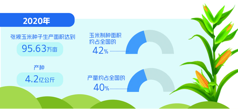 早在1989年,张掖就被确定为全国玉米种子生产基地。2013年,张掖市及甘州区、临泽县、高台县被认定为国家级杂交玉米种子生产基地,成功注册“张掖玉米种子”地理标志证明商标,成为国内唯一的农作物种子地理标志证明商标。2020年,张掖玉米种子生产面积达到95.63万亩,产种4.2亿公斤,玉米制种面积和产量分别约占全国的42%和40%。“这意味着全国每两粒玉米种子中就有一粒产自张掖。”吕国斌说。