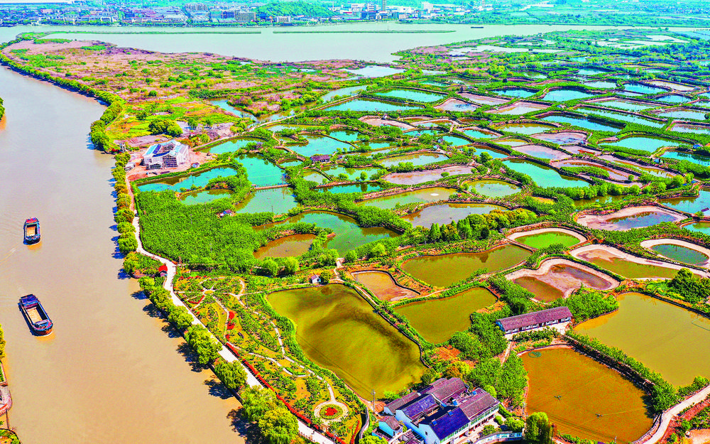 4月12日,航拍浙江省南浔区和孚镇星罗棋布的千年桑基鱼塘系统。 桑基鱼塘是块“活化石”,被列入全球重要农业文化遗产。近年来,当地通过桑树补植、鱼塘修复、河道疏浚等措施,对原生态桑基鱼塘系统进行修复性保护和利用,使这一历史悠久的生态循环农业模式重新焕发如画的容颜,生生不息。
