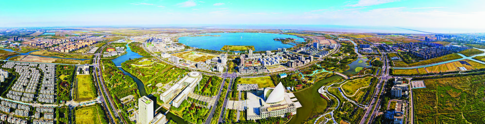图② 沿长江11省市积极探索生态优先、绿色发展之路,共同奏响高质量发展新乐章,让一江清水更好地惠泽人民。图为位于杭州湾与长江河口交汇处的上海临港新城滴水湖畔景色。 新华社记者 方 喆摄