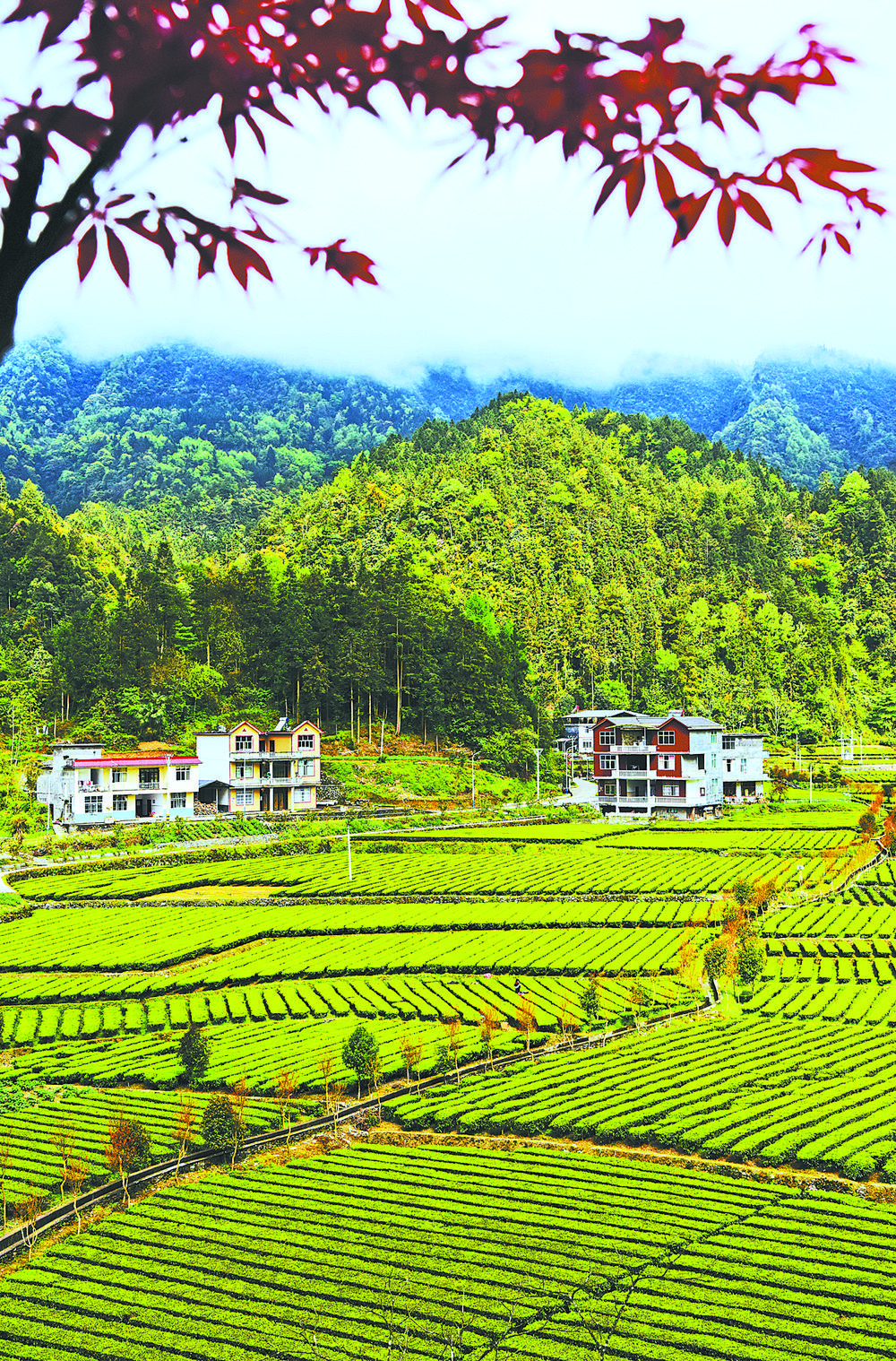 4月15日,湖北省咸丰县黄金洞乡大沙坝村,嫩绿的茶园与远山、红叶、民居交相辉映,构成一幅乡村振兴的生态画卷。