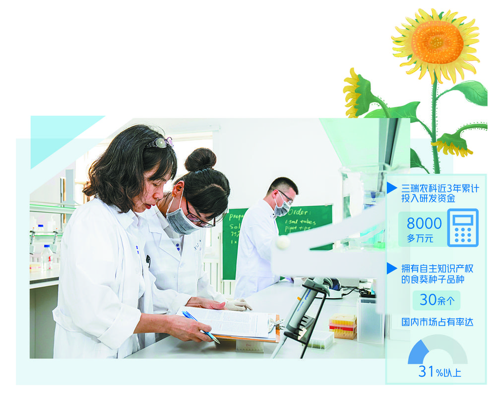 作为一家专注食葵种子产业、已实现“育繁推”一体化的现代种业公司,三瑞农科始终把科技创新放在首位,近3年累计投入研发资金8000多万元,建成了向日葵系统化技术研究机构、研发育种基地及制种基地,研发了拥有自主知识产权的30余个食葵种子品种,国内市场占有率达31%以上。