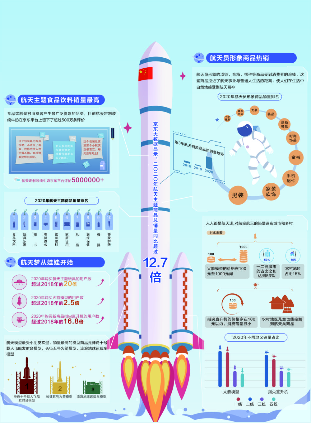 经济日报携手京东发布的数据显示,2020年包含食品、玩具、图书、家居等航天主题商品的总销量超过2019年的12.7倍。2020年购买航天主题玩具的用户数超过2018年的20倍,航天员形象的服饰、项链及摆件在“95后”消费者中深受欢迎。