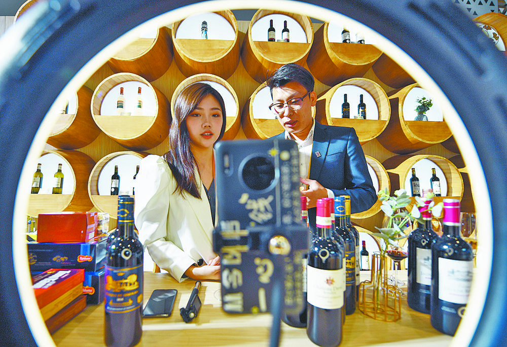 图② 第三届进博会食品及农产品展区,参展商通过网络直播在线上展台展示商品。