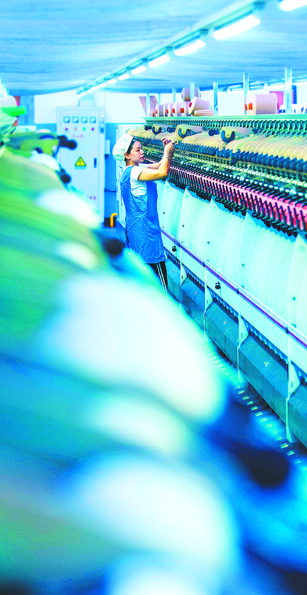 ◀5月1日,浙江省诸暨市浙江富润纺织有限公司纺织车间员工坚守岗位忙生产。今年1-4月份,该公司出口额达1000万元,同比增长12%。 郭 斌摄