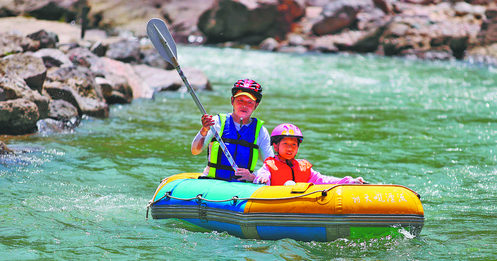 ◀5月1日,湖北省宜昌市兴山县朝天吼漂流景区安全救生员舒成龙(左),陪伴小游客漂流,保障游客安全。 乔长姣摄