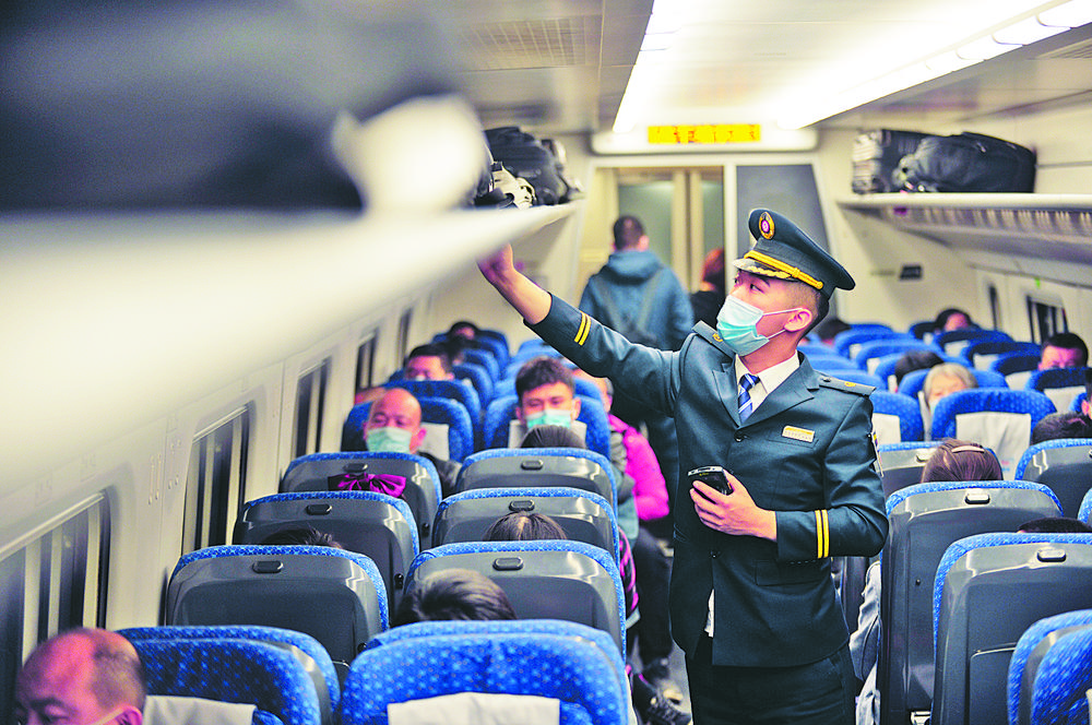 ▼5月1日,在呼和浩特开往鄂尔多斯的D6961次列车上,列车安全员张嘉伟在列车上进行安全巡查。包头客运段的列车乘务员们忙碌在岗位,在工作中度过节日。 甄 鹏摄