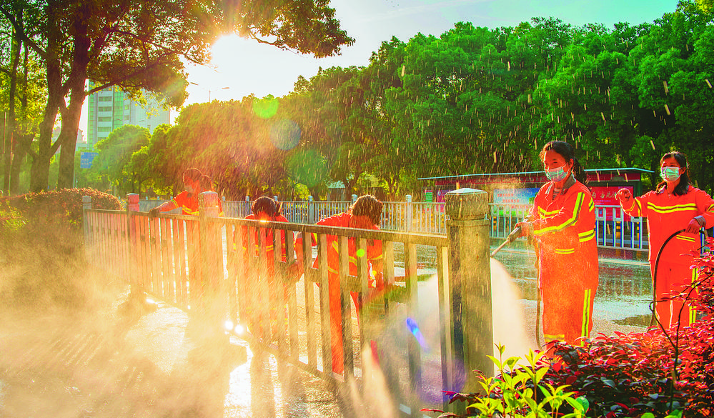 ▲5月1日,江西省樟树市环卫工人在城区清洗护栏,美化街道。 陈 晗摄