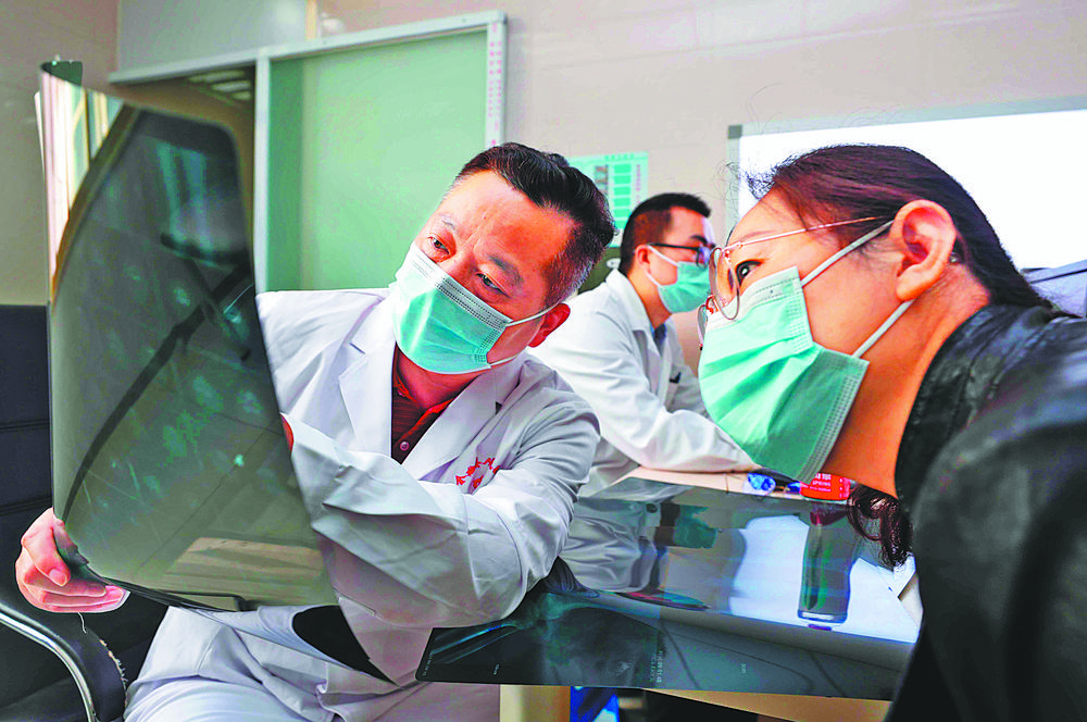 ▲5月1日,安徽省全椒县人民医院,上海交通大学附属第六人民医院关节外科主任张先龙(左)在为患者义诊。 沈 果摄