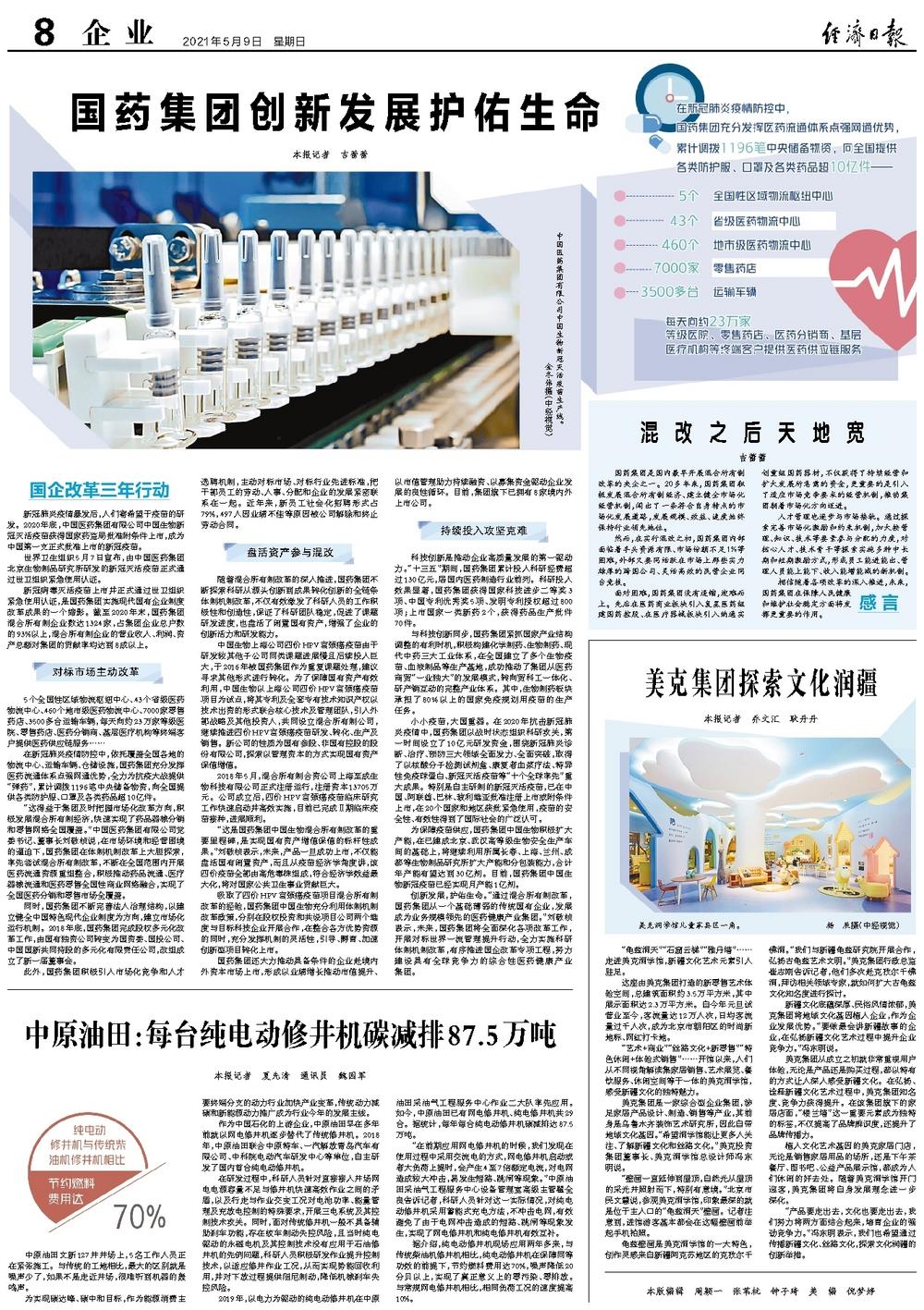 新冠病毒灭活疫苗上市并正式通过世卫组织紧急使用认证,是国药集团实施现代国有企业制度改革成果的一个缩影。截至2020年末,国药集团混合所有制企业数达1324家,占集团企业总户数的93%以上,混合所有制企业的营业收入、利润、资产总额对集团的贡献率均达到8成以上。