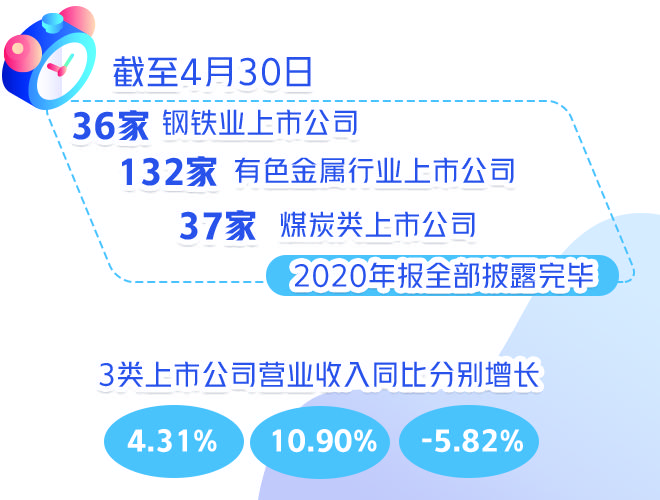 同花顺iFind统计显示,截至4月30日,36家钢铁业上市公司、132家有色金属行业上市公司、37家煤炭类上市公司2020年报全部披露完毕,3类上市公司营业收入同比分别增长4.31%、10.90%、-5.82%,营业利润分别同比增长15.93%、-25.97%、-95.93%,归属母公司净利润同比分别增长9.97%、-2.79%、-47.12%。