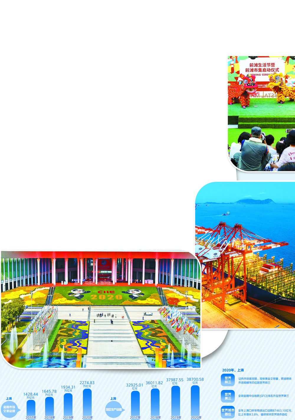 今天的上海,经济发达、实力雄厚。2020年,全市生产总值达3.87万亿元,总量规模跻身全球城市第六位。全球金融中心指数、新华·波罗的海国际航运中心发展指数排名世界第三,口岸贸易总额达8.75万亿元、位居全球城市首位,上海港集装箱吞吐量达4350万标准箱、连续11年位居世界第一。现代服务业为主体、战略性新兴产业为引领、先进制造业为支撑的现代产业体系初步形成,产业基础能力和产业链水平不断提升。