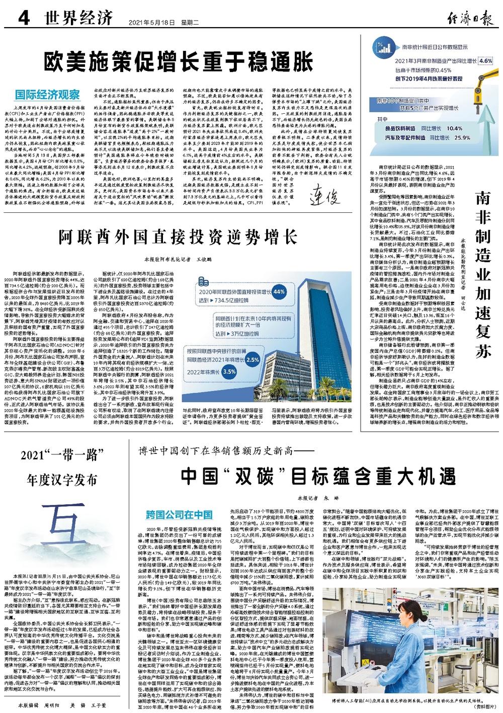 碳中和是博世将战略重心投向未来的关键领域之一。博世亚太一区环境健康安全及可持续发展总监朱伟伟在接受经济日报记者采访时介绍说,作为工业制造企业,博世集团于2020年在全球400多个业务所在地实现了碳中和目标,成为全球首家实现碳中和的大型工业企业。“中国是博世集团全球生产和研发网络中的重要组成部分,博世在中国同样运用了实现碳中和的综合路径,涵盖提升能效、扩大可再生能源供应、购买绿色电力、用碳抵消方式补偿不可避免的碳排放等方面。”朱伟伟告诉记者,自2019年至2020年底,博世中国在46个业务所在地先后启动了319个节能项目,节约4800万度电,相当于1.5万户家庭的年用电量,碳排放减少3万余吨。从2019年到2020年,博世中国在气候保护、实现碳中和方面投入超过1.2亿元人民币,其他环保相关投入超过1.3亿元人民币。