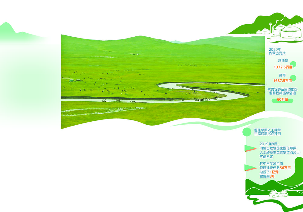 退化草原人工种草生态修复试点项目主要针对草原退化、沙化问题,选择草甸草原区、典型草原区和荒漠草原区作为试点区域,探索总结人工修复和自然恢复相结合的综合治理技术及管理新模式,为今后内蒙古乃至全国草原生态修复治理工作提出一揽子解决方案。2019年8月,内蒙古批复国家退化草原人工种草生态修复试点项目实施方案,其中巴彦淖尔市项目建设任务56万亩,总投资1亿元,建设期3年。重点围绕因过牧而导致中重度退化、沙化的牧场进行生态修复与植被恢复,并对试点区域关键技术集成创新与示范,开展生态修复工程效益监测与评估。
