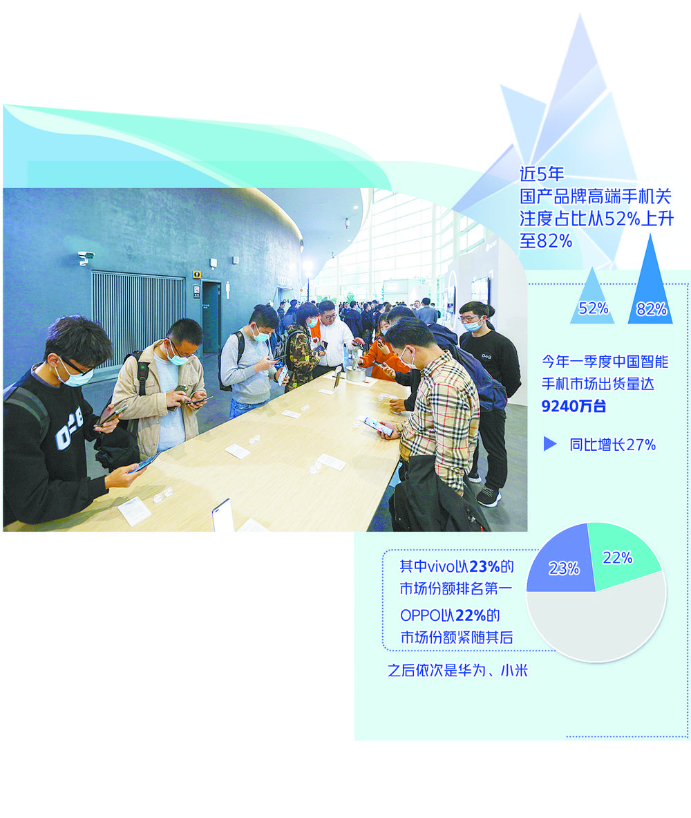 国潮受青睐,除了外观设计令人耳目一新外,更重要的是产品背后不断升级的技术能力。以手机行业为例,百度给出的数据显示,近5年,国产品牌高端手机关注度占比从52%上升至82%。