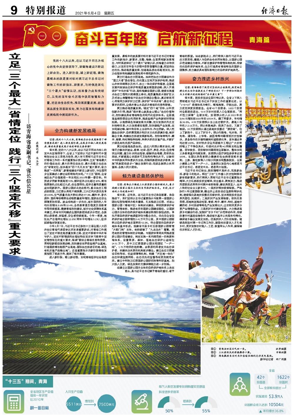今年3月7日,习近平总书记参加十三届全国人大四次会议青海代表团审议并发表重要讲话,对青海工作提出了坚定不移走高质量发展之路、坚定不移做中华水塔守护人、坚定不移增进民生福祉和在党史学习教育中坚定理想信念的重大要求,强调“要结合青海优势和资源,贯彻创新驱动发展战略,加快建设世界级盐湖产业基地,打造国家清洁能源产业高地、国际生态旅游目的地、绿色有机农畜产品输出地”。这些重要指示为新阶段青海发展指明了前进方向、提供了根本遵循。