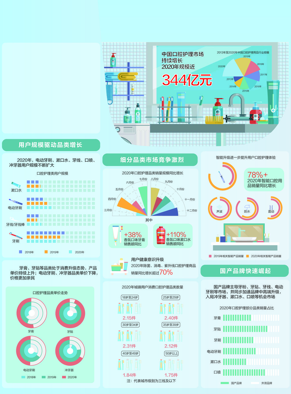 目前,不少消费者的关注点已从基本的口腔清洁功能转化为对牙齿美白、防护保养等多功效,以及对使用便捷感、体验愉悦感的追求。2020年智能口腔护理用品销量同比增长78%,具有无线充电、触屏等功能的智能化用品和APP指导刷牙、洗牙等个性化定制服务受到越来越多消费者的青睐。口腔护理理念和差异化需求的升级,使得口腔护理用品消费多元化特点日益突出。