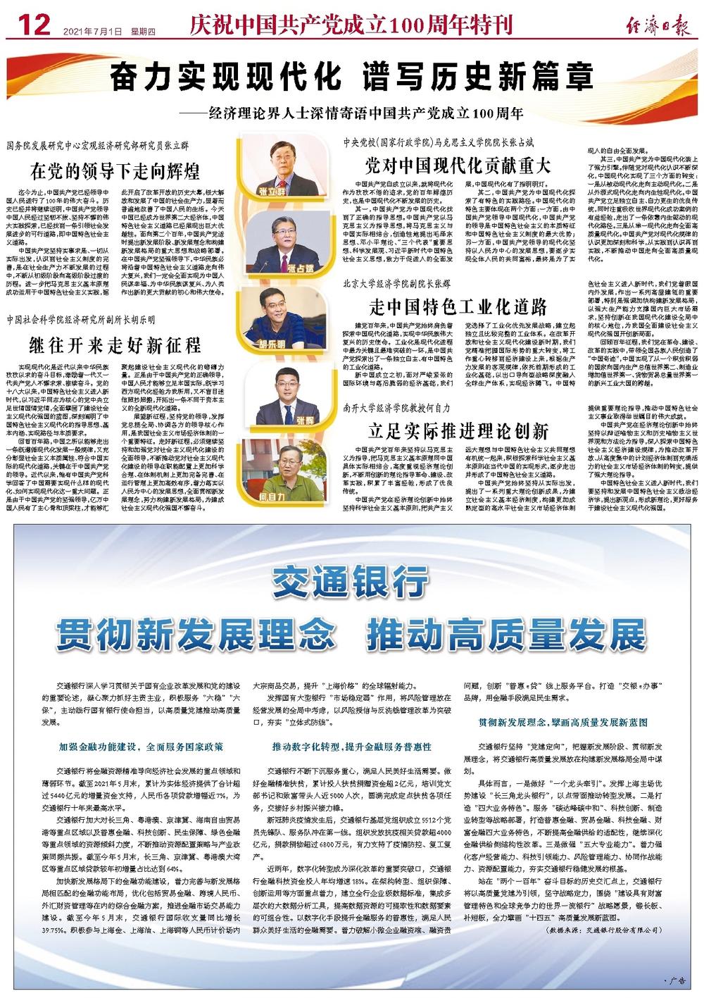 奋力实现现代化 谱写历史新篇章 ——经济理论界人士深情寄语中国共产党成立100周年 2021年07月01日