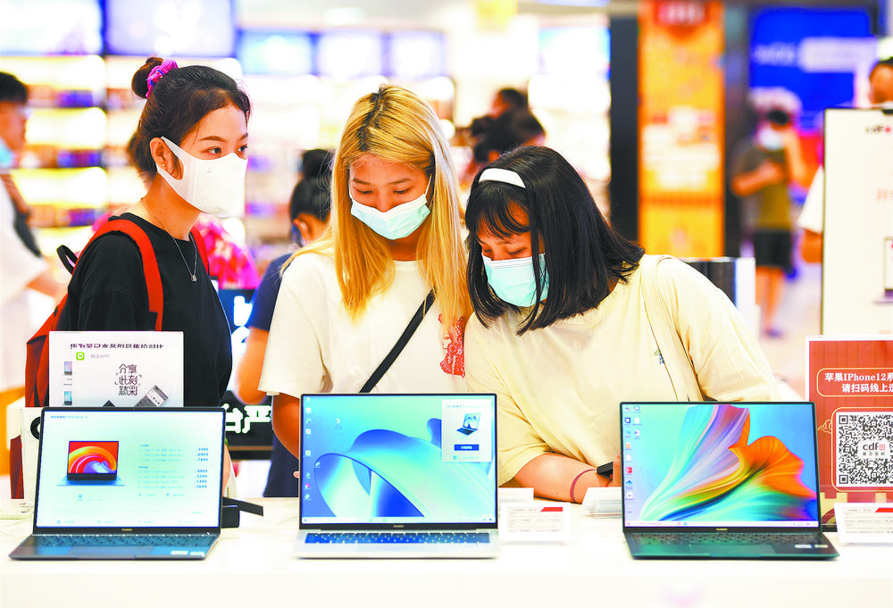7月2日,顾客在海南海口市日月广场免税店购物。据海口海关统计,自2020年7月1日离岛免税新政实施至今年6月30日,海关监管离岛免税购物金额468亿元、同比增长226%,件数6072万件、同比增长211%,购物旅客628万人次、同比增长102%。