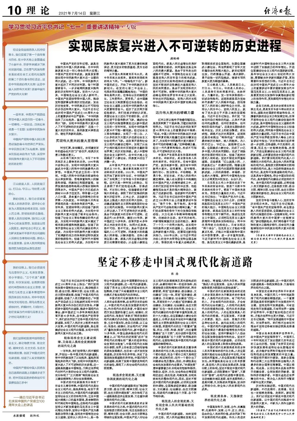 从中国共产党成立100年到新中国成立100年,蕴含着民族复兴不可逆转的历史进程。2021年,中国共产党开始了新的百年长征,中华民族开始了实现第二个百年奋斗目标的新征程。这不仅是一种时间上的契合,而且表明了我们党饱经沧桑、百炼成钢,不忘初心使命,创造着政党不断强大的奇迹;表明了我们党推动民族复兴历经百年、从未止步,正在新的起点上推进人类历史的伟大创举,立志建成富强民主文明和谐美丽的社会主义现代化强国。中华民族伟大复兴之所以进入了不可逆转的历史进程,是由于民族复兴的目标不可逆转,这是近代180多年来、建党100年来、新中国成立70多年来、改革开放40多年来从未改变的目标,如同大江奔流,势不可挡、势不可变。是由于追求幸福的人心不可逆转,民族复兴的底蕴是人民幸福,从解决温饱、总体小康到全面小康,都是人民日益增长的物质文化需要的驱动;从全面小康到全面现代化,都是人民日益增长的美好生活需要的驱动,共同富裕正是全体人民的最大愿望。是由于百年走出的道路不可逆转,中国特色社会主义道路是党和人民百年奋斗的根本成就,是经过历史比较和选择的正确道路,坚定不移走好这条康庄大道是党和人民的共同意志。是由于实现目标的大势不可逆转,统筹中华民族伟大复兴战略全局和世界百年未有之大变局,科学应对风险挑战,党和人民对实现中华民族伟大复兴的中国梦充满必胜信心。