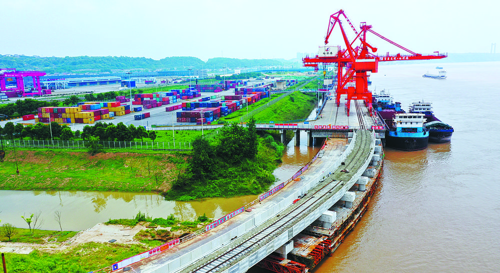 7月16日,三峡枢纽宜昌白洋港正在铺设轨道,这是国内首条引入码头平台的集装箱新型铁路。白洋港主体工程计划今年底完工试运行,可实现铁水无缝对接。刘卫东摄(中经视觉)