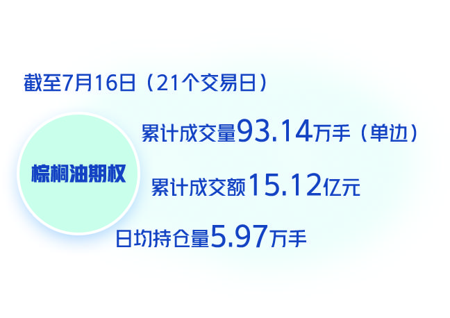 截至7月16日,棕榈油期权共计运行了21个交易日,期间累计成交量93.14万手(单边,下同),累计成交额15.12亿元,日均持仓量5.97万手。棕榈油期权成交量、持仓量分别占标的期货的4.0%和9.3%,占大商所所有期权成交量和日均持仓量的8.9%和4.2%,日均换手率为0.9,处于合理水平。